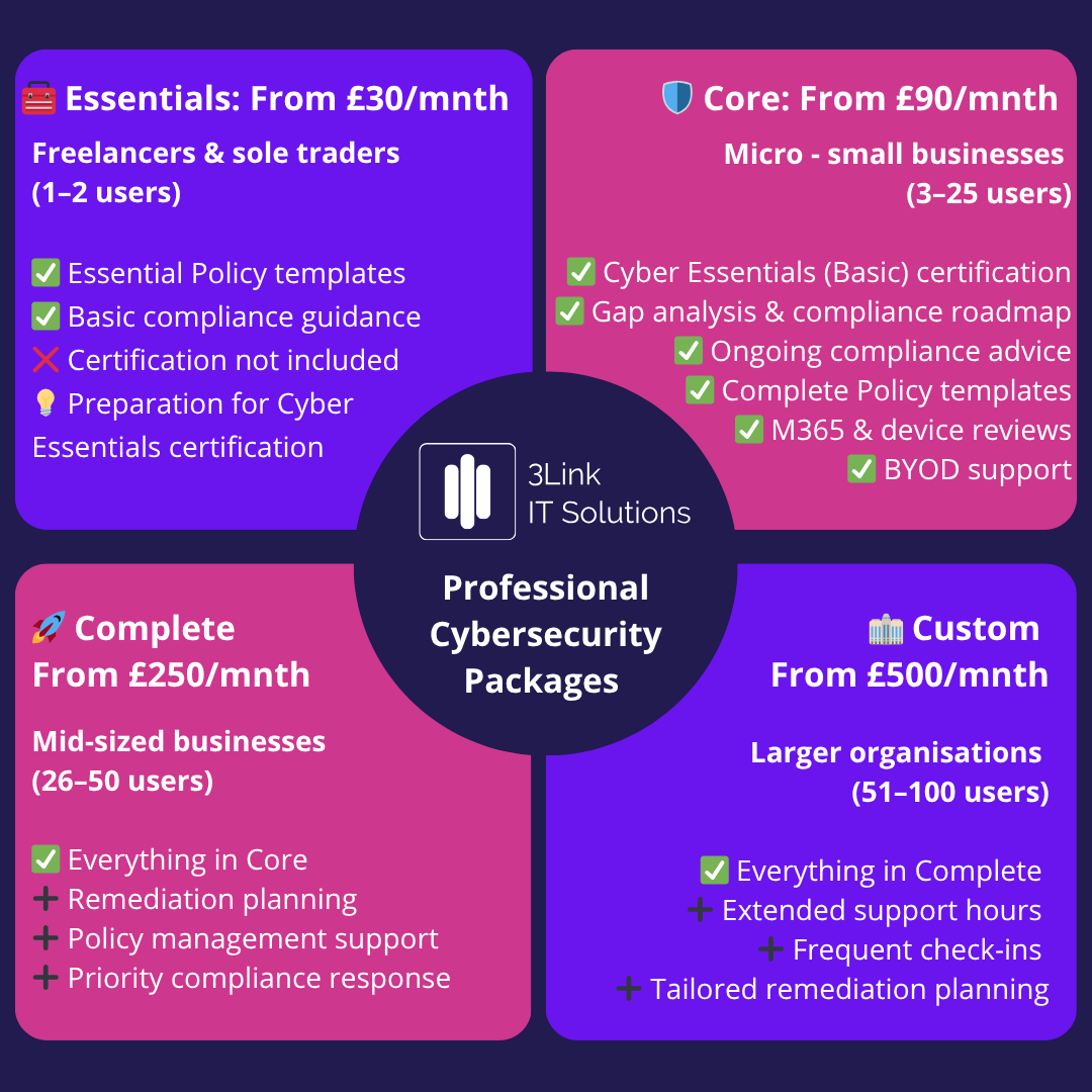 Whether you’re preparing for Cyber Essentials, need help getting certified, or want to go further with ongoing compliance, our packages have you covered.